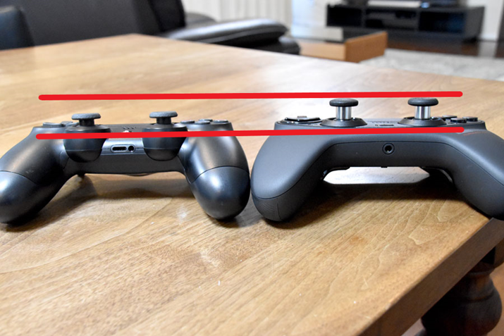 DUALSHOCK 4(左)と、最も高さがあるスティックに交換したASTRO C40 TRコントローラー(右)。その高さを比べてみると、一目瞭然!