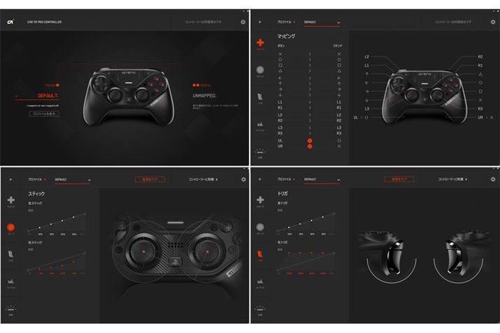 ASTRO C40 TR Configuration Softwareの画面例。トップ画面(画像左上)、マッピング設定(画像右上)、スティック設定(画像左下)、トリガー設定(画像右下)
