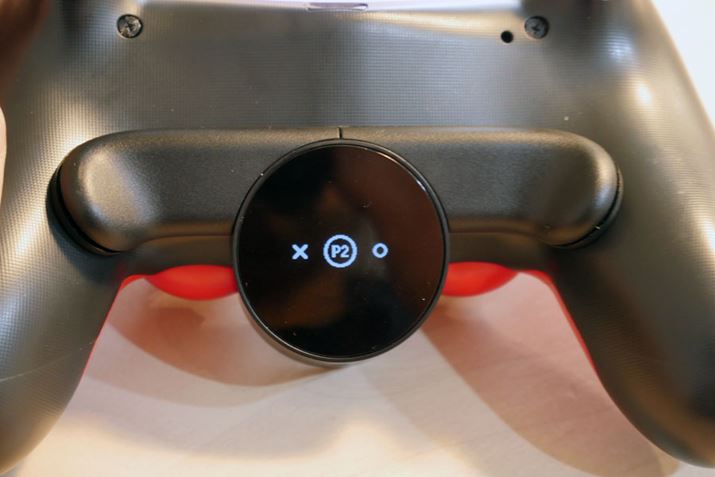 SIE公式の「DUALSHOCK 4 背面ボタンアタッチメント」。円形の部分は、有機ELパネル搭載のボタンになっており、この上部の左右に伸びた部分が拡張ボタン
