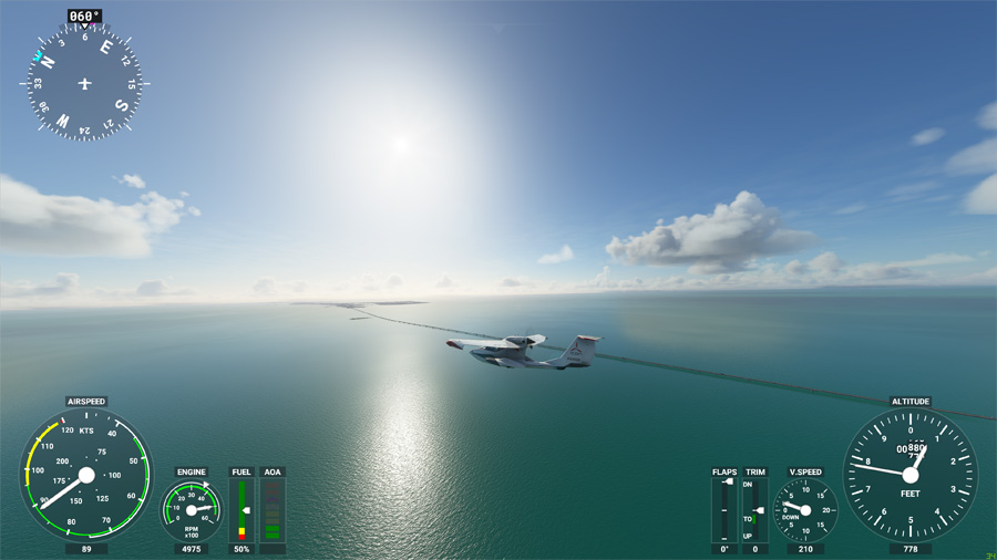 MSFS2020では任意のポイントから飛行を開始できるので、今回は上空からキーウェストを望む。壮大なスケールは期待以上で、フロリダの緑味を帯びた海もよく再現されている。HDRでプレイすると、日差しの強さ、海面や機体を反射する光が強烈でリアルだ。「トゥルーライズ」で爆破されたポイントが見つからないのは残念だったが、キーウェストの街も美しく描かれ、満足の行く旅だった。