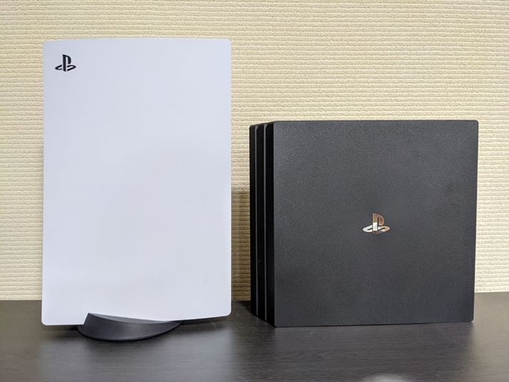 約295(幅)×327(奥行き)×55(高さ)mmの「PS4 Pro」と比較してみたところ、「PS5」のほうがひと回りほど大きいです