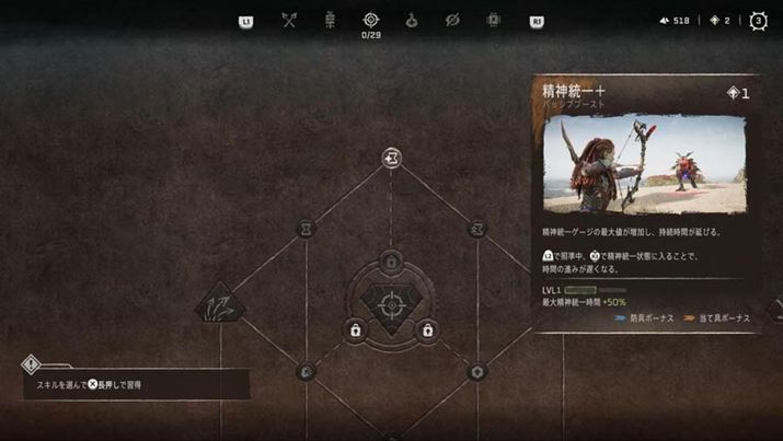 今作ではレベルアップやクエスト報酬で手に入る「スキルポイント」を使って、6種類のスキルツリーからスキルを習得してアーロイを成長させられます。スキルツリーを進めていくと「勇技」という必殺技も習得できるようになりました。