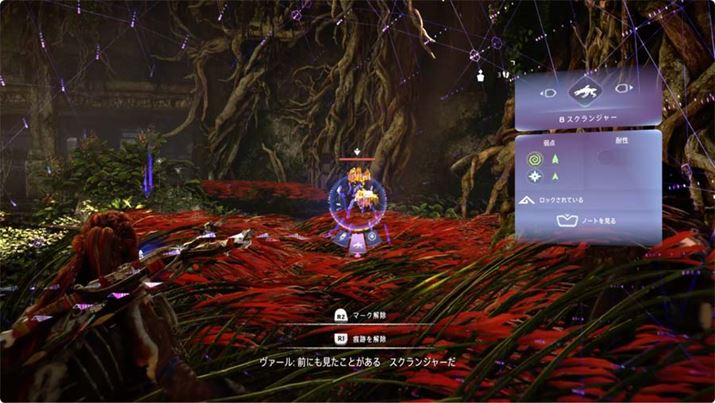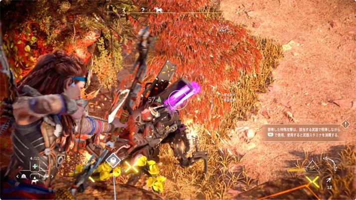 アーロイは、機械獣の弱点をスキャンしたり、古の建造物を操作したりと、肉眼では見えない情報を集める「フォーカス」という特殊な装置を扱えます。ほかのゲームで言うところのスキャンモードのような役割で、これを活用することで、本作ならではの戦術性に富んだバトルが楽しめるようになっています。