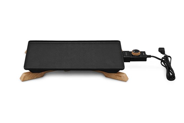 立てかけて収納できる薄型プレートと、折りたためるX型の脚を採用したホットプレート。プレートを置く脚は、アウトドア用の鍋敷きや木の台をイメージし、温かみを感じる木目調のデザインを採用した。
