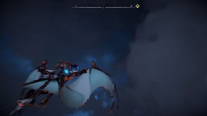 グラフィックの美しさ以上に押さえておきたいのが、PS5の処理能力を生かしたダイナミックなゲーム体験の数々だ。本DLCでは、マップの高度が本編の3倍まで高くなっており、はるか上空までサンウィング(プテラノドンの機械獣)に乗って飛び、巨大な雲の中を飛ぶ壮大なプレイが体験できる。