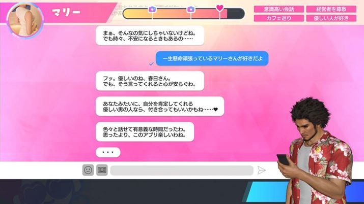 アクティビティーも「龍が如く」らしいユニークなものが多く、バイト感覚でお金を稼げる「クレイジーイーツ」や、女性とチャットしてデートできるマッチングアプリなどの新規要素だけではなく、主人公・春日の人間力を上げられる資格検定や、各仲間との会話が楽しめる絆ドラマなど、前作から継承されているアクティビティーも登場。シリーズ特有のコミカルなサイドストーリーも50個以上用意されており、やり込み要素は非常に豊富だ。