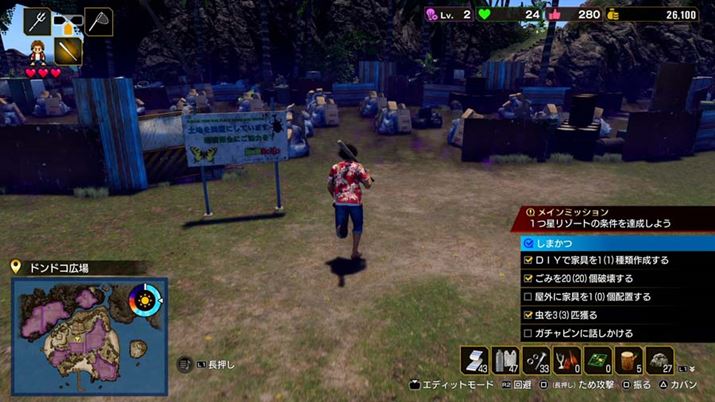 最初はゴミだらけのエリアを整地していき、木や石材、プラスチックなどの素材を集めて作る家具や建物を配置して島の充実度を上げていける。充実度を上げてリゾートランクを上昇させると、その都度新しいエリアが解放され、探索できる場所や配置できるモノの数が増える。