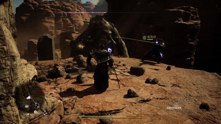 ほかにも、巨大な敵に対しては、敵の体にしがみついて頭を直接剣で攻撃したり、敵がふらついた瞬間に足を重点的に攻撃することでダウンをとったりして戦うのがセオリーだが、仲間ポーンにソーサラージョブがいれば、大ボスでも魔法で一気に敵の体力を削って倒せるのだ。