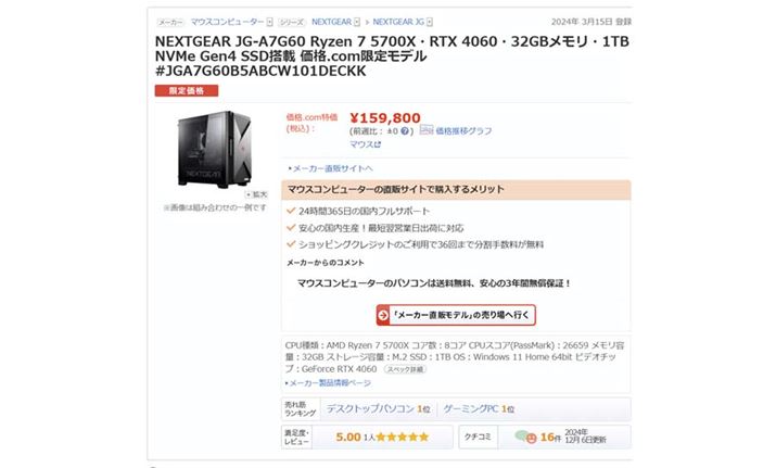 なお、CPUやメモリー、SSDのスペックを抑えれば、推奨要件で紹介したゲーミングPCとほぼ同額で、かつ、高要件の「GeForce RTX 4060Ti」を搭載するゲーミングPCもある。