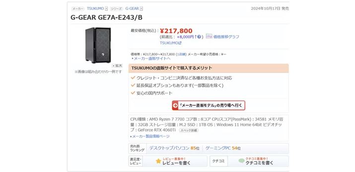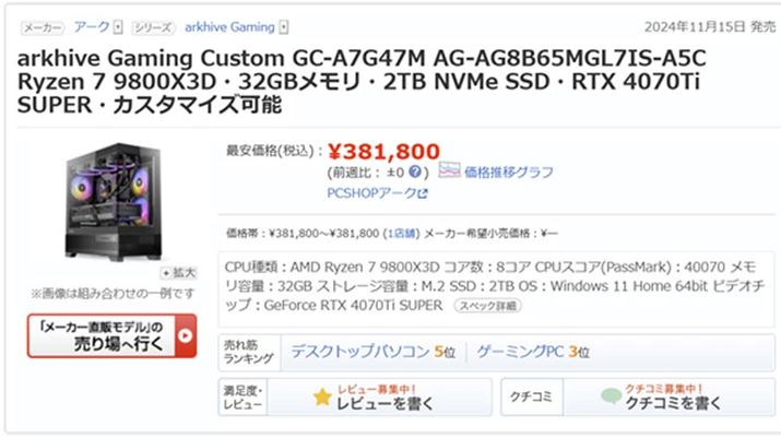 このほかにも「GeForce RTX 4070Ti SUPER」を搭載したモデルは多数ある。CPUのグレードを下げることで、若干だが「arkhive Gaming Custom GC-A7G47M」より低価格なモデルもピックアップしたので、以下のURLからご確認いただきたい。