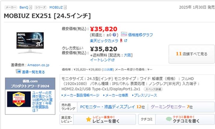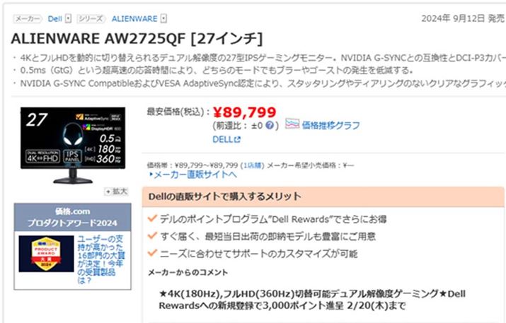 モニターサイズが27インチと、4Kを堪能するには若干物足りないサイズだが、4Kゲーミングモニターの中ではかなりお買い得な製品と言える。なお、本製品は価格.comでの最安価格が7万強〜9万円弱と頻繁に変動するため、気になる人は定期的にチェックしていただきたい。