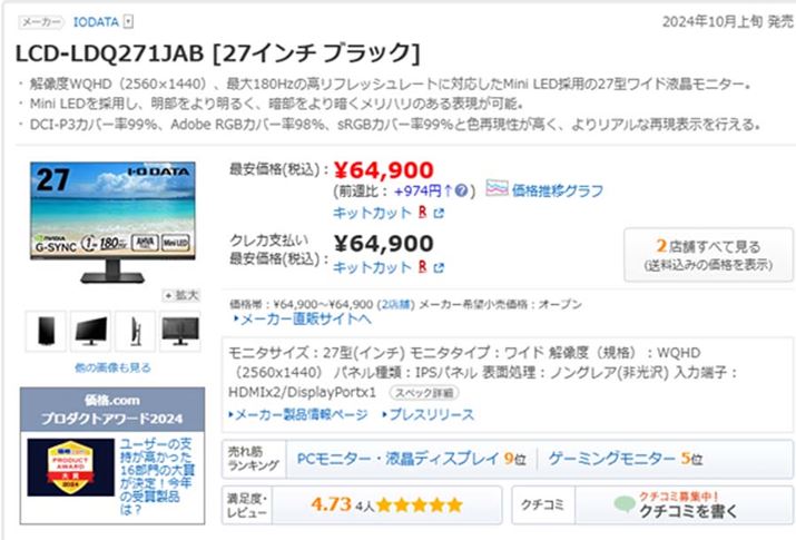 「LCD-LDQ271JAB [27インチ ブラック]」は、WHQD、かつリフレッシュレート最大180Hzに対応するモニター。画面サイズは27インチ。価格は約65,000円と高価だが、それは画質向上を図る機能が搭載されているためだ。