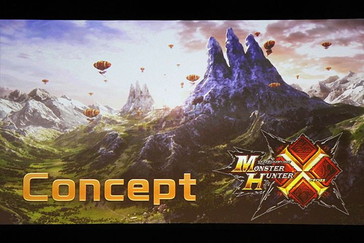 イベントの前半が終わり、会場も十分に暖まってきたタイミングで行われた“モンハン最新情報発表”コーナーで突然発表されたのが、モンスターハンターシリーズの最新作だ。タイトル名は「モンスターハンタークロス」。モンスターハンターシリーズのプロデューサーである辻本良三さんいわく、「派手に気持ちよくプレイできる部分も作りたい」ということで、それを具現化させたタイトルになるとのこと。