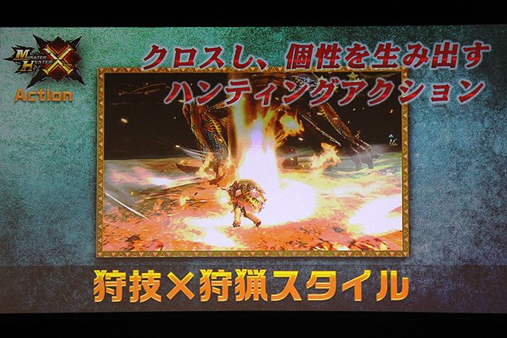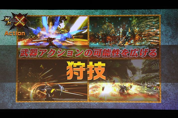 新作のプロデュースを担当する小嶋慎太郎さんの解説によると、モンスターハンタークロスと本編との最大の違いは“狩技”と呼ばれる、各種武器ごとの技が用意されること。必殺技のようなもので、これまでも“溜めて打つ”など武器固有の技があったが、それらをすべての武器に盛り込むとのこと。派手な演出も加わるとのことで、プレイしていて気持ちよいものとなりそうだ。