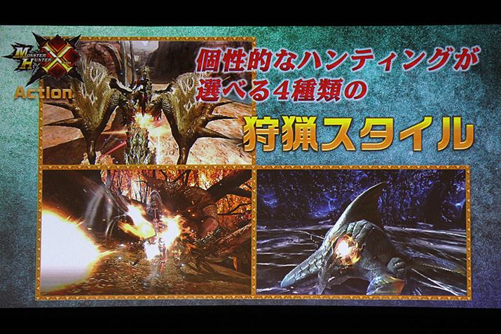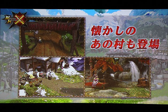 また、モンスターハンタークロスは、“モンスターを踏み台にして、より高い場所へと飛ぶ”といった、新たなアクションを含めた個性的な4つのスタイルが選べるというのも特徴だ。これを“狩猟スタイル”と呼ぶそうだが、具体的なことは、これから徐々に発表していくとのこと。なお、新作での拠点はベルナ村という高原をイメージした新たな場所になるが、従来作品に登場したその他の拠点も登場するとのこと。