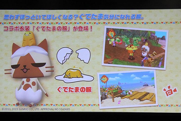 コラボレーションも複数用意されているとのことで、今回公開されたのはマリオの服と、「どうぶつの森」のたぬきちの服を着たアイルー。さらに、サンリオともコラボしているということで、テレビ番組「あさチャン!」で人気の「ぐでたま」から、ぐでたまの服が登場する。こんなにかわいらしいアイルーたちと過ごせるのだから、発売日が待ち遠しい人も多いだろう。