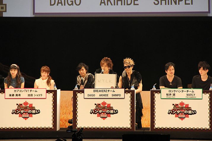 チームは全部で6組。「一狩り行こうぜチーム」は岡田義徳さんとアイドリング!!!の酒井瞳さん。「カプコンTV!チーム」は後藤真希さんと池田ショコラさん。「BREAKERZチーム」はSHINPEIさん、DAIGOさん、AKIHIDEさん。「ロックハンターチーム」はDragon Ashの桜井誠さん、THE BAWDIESのMARCYさん。「美女と野獣チーム」は怒髪天の増子直純さん、水崎綾女さん。「モンハン大好き芸人チーム」はインパルスの堤下敦さん、コンマニセンチの堀内貴司さん