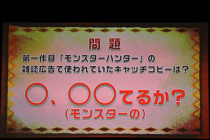 この後、“狩スマハンター決定戦”の後半戦がスタート。3回戦は“モンハンクイズ対決”と題し、「モンスターハンター」に関するさまざまなクイズを解答すると、問題の難易度ごとにポイントがもらえるというクイズが行われた。2問目までは4択問題、3問目からはイントロを聞き、どのモンスターのテーマかを答えるもので、最終問題はシリーズ第1作目の広告キャッチコピーを答えるという、ベテランハンターでも手強い難問が出された。
