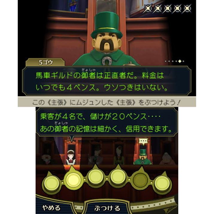 法廷パートでは、探偵パートで集めた証言や証拠品を武器に、ウソをついたりムジュンした発言をする証人や検事らと戦う。まずは、証人による証言を検証する尋問で、証言にウソやムジュンがないか、ゆさぶったり問い詰めたりしていく。証言にムジュンを見つけたときは、それを示す証拠品を突きつけて“異議あり!”と叫ぶのだ。間違えていた場合はペナルティを科せられてしまうが、ムジュンを指摘することに成功すれば、大逆転の展開が待っている!