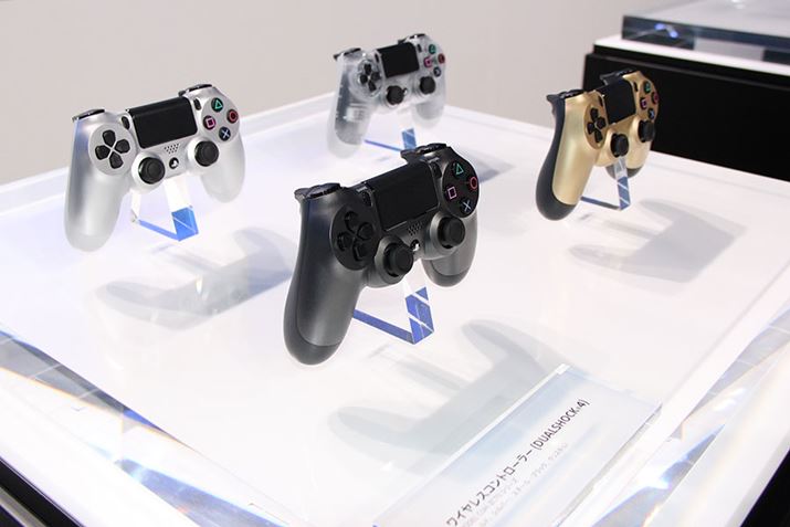 4色そろったデュアルショック4。限定色であるゴールド、シルバー、スチール・ブラックの価格は6,480円(税別)、定番カラーラインアップの1つに加わるクリスタルは5,980円(税別)で発売される