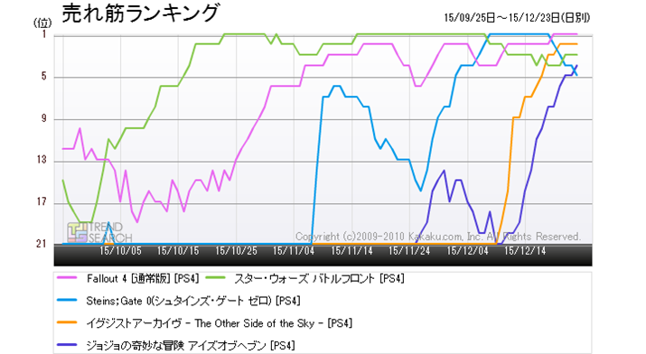 次に、ゲームソフトの売れ筋製品を見てみよう。まずは、据え置き型ゲーム機の「PS4」であるが、図5で示した2015年12月24日現在の売れ筋ランキングでは、1位がベセスダのRPG「Fallout 4」(12/17発売)、2位がスパイク・チュンソフトのRPG「イグジストアーカイヴ」(12/17発売)、3位がエレクトロニック・アーツのシューティングゲーム「スター・ウォーズ バトルフロント」(11/19発売)となっている。ただ、ランキングの推移を見るとわかるように、全体的に大きな人気となっているのは、ベセスダ「Fallout 4」と、エレクトロニック・アーツ「スター・ウォーズ バトルフロント」というところで、そのほかの3製品は、発売日に合わせて急激に売れてきたという感じが強い。