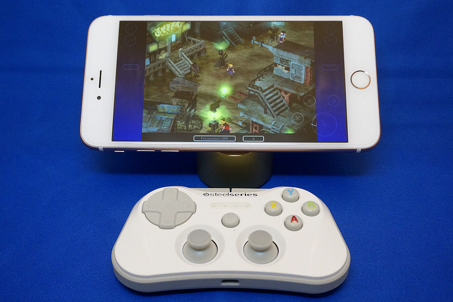 写真のMFiコントローラーは、SteelSeries社の「SteelSeries Stratus」。iPhone 6S Plusよりも小型で、約75gと持ち運びに便利。バッテリー内蔵でMicro USBで充電
