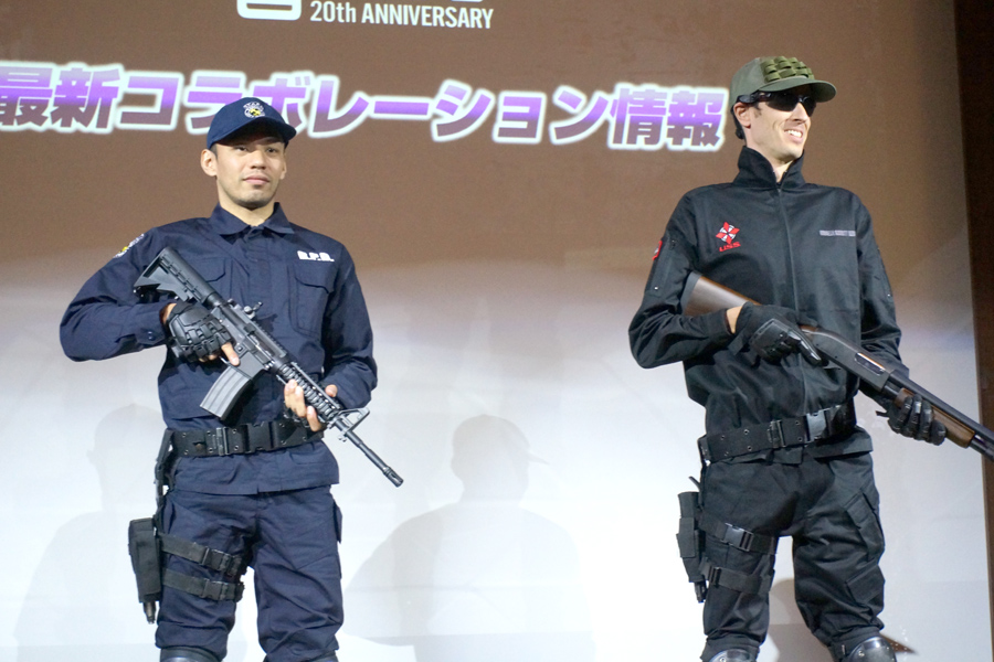 さまざまなコラボグッズも紹介された。イベント会場には、格闘家の鈴木悟さんと「バイオハザード アンブレラコア」プロデューサーのバンス・ジェームス氏が、「Battle Dress Uniform」に身を包み、コラボライフルを構えて登場した。
