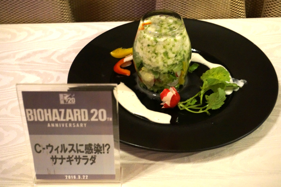 また、東京や大阪などのカラオケパセラやロスカボス、カプコンカフェで、20周年記念のコラボメニューを実施することが決定。コラボメニューは会場内で振る舞われた。筆者が試食した「C-ウィルスに感染!さなぎサラダ」は見た目のインパクトもすごいが、中身が「トロロ」でねばねば感が妙な不安感を与える。味は美味しいが、本当に感染しそうだ。