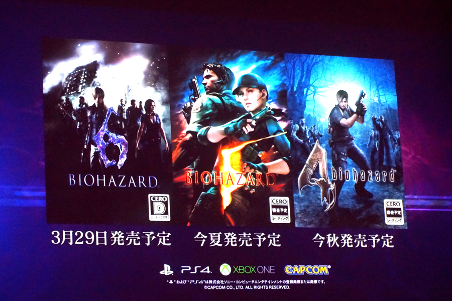 このほか、シリーズの人気作「バイオハザード4」「バイオハザード5」「バイオハザード6」が「PlayStation 4」と「Xbox One」でリメイクされる。いずれも高解像度化と高フレームレート化を行い、別売DLCや追加されたコンテンツも収録する。「バイオハザード6」は3月29日よりダウンロード版限定で配信が開始される。「バイオハザード5」は2016年夏に、「バイオハザード4」は2016年秋に発売される予定だ。