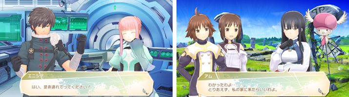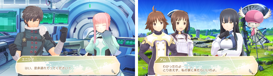 ラージュ(画像左の男性)とアム(画像右の右側の女性)、それぞれの主人公の視点で物語を体験し、その後どちらの主人公で進めるか選択する。仲間と交流しながら、繭世界を冒険しよう