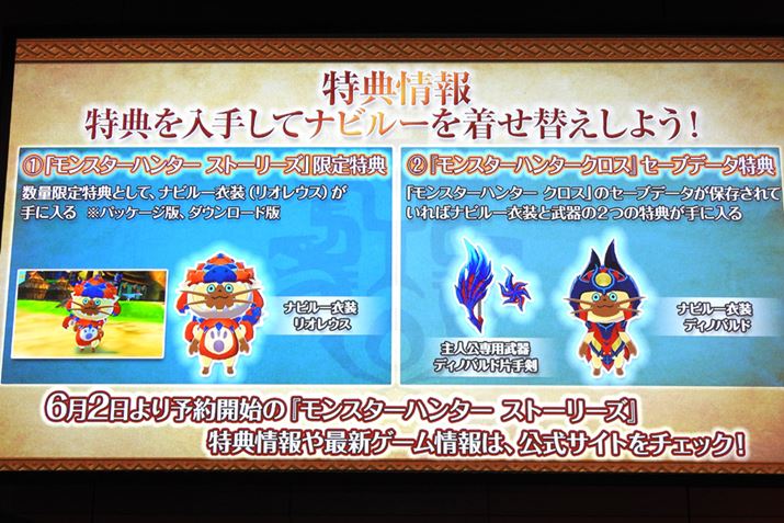 2016年6月2日より予約が開始される。なお、予約すると数量限定特典の「ナビルー衣装リオレウス」のほか、「モンスターハンタークロス」のセーブデータの保存を条件に、「ナビルー衣装ディノバルド」がもらえる