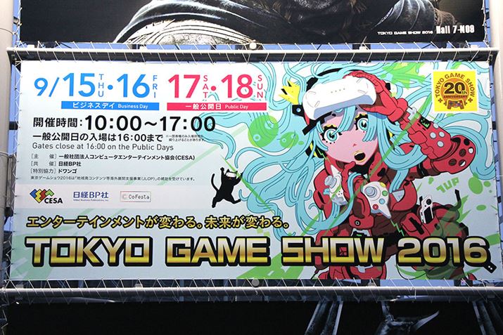 9月15日の朝方は雨が降っていたものの、日中はそれもやんで大勢の来場者に恵まれた「東京ゲームショウ2016」。開催時間は10時〜17時まで(9月17〜18日の一般公開日の入場は16時まで)。入場料金は、一般(中学生以上)の前売が1,000円、当日が1,200円、小学生以下が無料となる