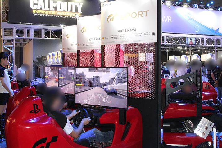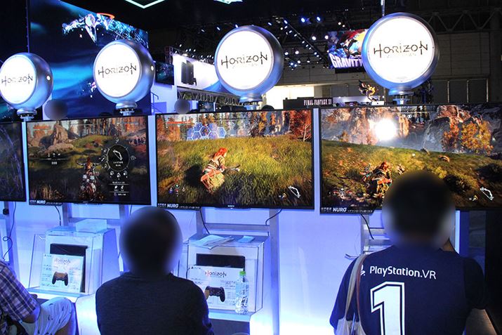 昨年まではブースを2階建てで構築していた、ソニー・コンピュータエンタテインメント(SCE)改めソニー・インタラクティブエンタテインメント(SIE)。今年は平屋ブースだったが、それでもPS4で体験可能なタイトルをすべて揃えており、その勢いを見せつけていた。ブースの3ホール側に面した部分には、新型のスリムな「PS4」と高性能な「PS4 Pro」、そして注目の「PlayStation VR」などを展示している。ただし、PS4 Proは動作しているところは確認できなかった。