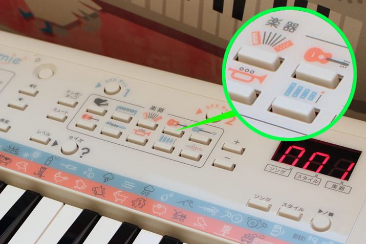 パネルのインターフェイス部分。代表的な10種類の楽器音色は、ボタンをポンと押すだけで切り替えられるようになっています。子どもでもわかりやすいように、楽器の名称ではなくアイコンが記載されているのがいいですね