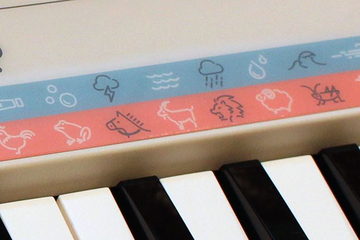 動物の鳴き声や乗り物の音は、該当する鍵盤の上にわかりやすいアイコンで表示されています。子どもでも感覚的に鳴らせますね