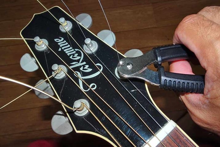 新しい弦をストリングポストに巻き付け、ストリングワインダーを使ってペグを回します。手で回すのと比べると、作業効率に雲泥の差を感じました。最後は余った弦を切り取れば弦の張り替えは完了です。
