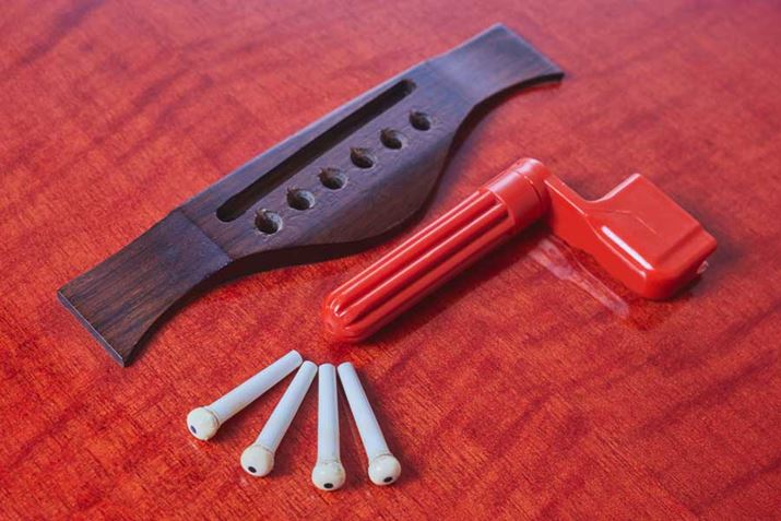 次に、ブリッジピンを抜く作業。音楽有識者の説明によると「傷をつけないためにはサウンドホールから手を入れて裏から押して上げるようにして抜くのがベスト」とありますが、硬くて抜けなかったので、ストリングワインダーを使いました。