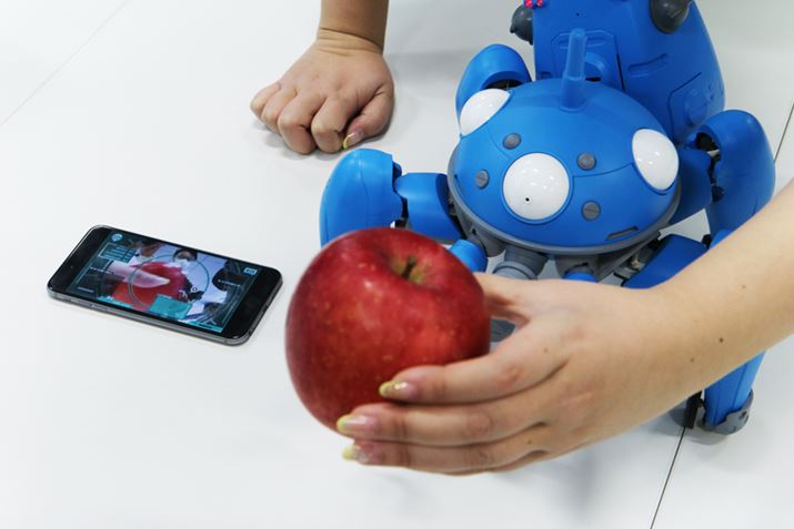 最後に紹介したいのが、原作にも登場した「並列化」の機能。「並列化」とは、簡単に言うと、あるタチコマが集積した記憶や情報をほかのタチコマと共有し経験値として蓄積する機能のことで、これを「1/8タチコマ」でも再現しているというわけです。具体的には、とある「1/8 タチコマ」の外部観測機器(映像センサー)のカメラにモノを見せると、クラウド上で物体認識エンジンが動作して物体の詳細を認識。たとえば、カメラにりんごを見せて「これは何?」と聞けば、「りんごです!」と回答してくれ、続けて「りんごは甘いんだよ」と教えると、この情報をクラウドに送信すると、ほかのユーザーが利用しているすべてのタチコマと「並列化」します。そして、数日後に別のユーザーが自分の「1/8タチコマ」にりんごを見せると、「知っているよ。りんごって甘いんでしょ」と答えてくれるといった具合です。ただし、タチコマが不適切なことや個人情報を言ってしまわないように、「並列化」される情報は一度チェックされる仕様になっています。