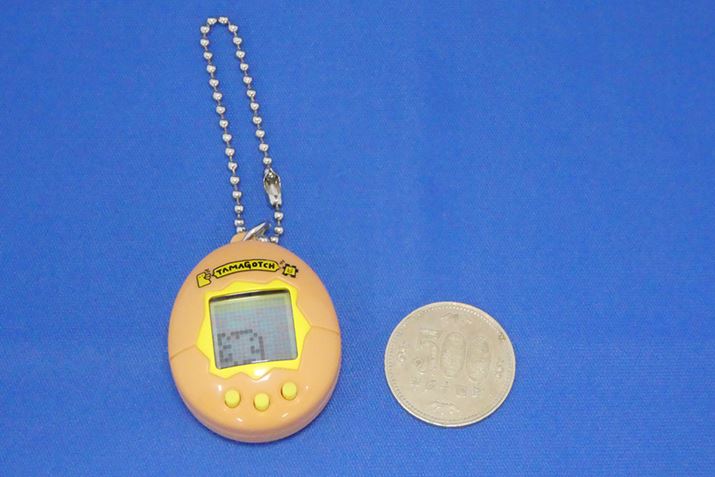 かえってきた! ちびたまごっちの本体。手に納まるサイズになっており、持ち運びに便利。500円玉と比較すると、一回り大きいといった感じ。小さいのでカバンなどに取り付けて、マスコットのように持ち歩ける