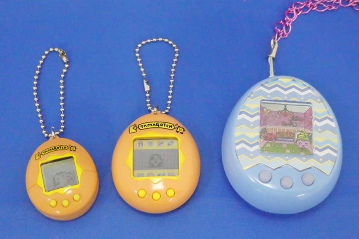 かえってきた!ちびたまごっち(左)と初代たまごっち(中央)、Tamagotchi m!x(右)を並べるとわかるが、現代のたまごっちは本体サイズが大きくなり、画面もカラー液晶に進化している。首からぶら下げて持ち運べるようにネックストラップも用意されている。ちなみに、Tamagotchi m!x(たまごっちみくす)の価格は5,555円(税込)と、初代たまごっちと比べるとやや高めに設定されている