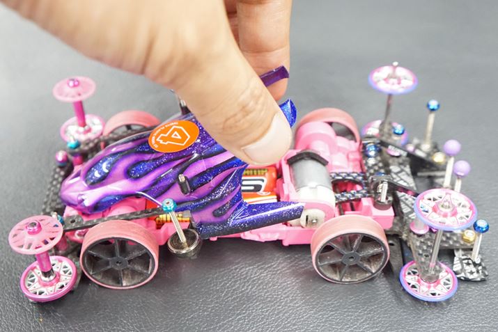 本来、ボディはシャーシに設置するんですが、このマシンはボディに重りをつけて上下に動作するように改造。このボディが、マシンがジャンプして着地した際の跳ね返りを抑えます。これは、「ボディ提灯」と呼ばれ、コースアウト防止のための上級者向けの改造です