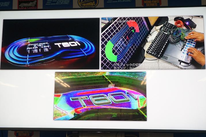 大阪の映像制作会社T601が開発したインタラクティブコンテンツ。ミニ四駆のサーキットにあらゆるセンサーを組み込み、音や環境に合わせて様々なグラフィックが自動的に発生するそうです