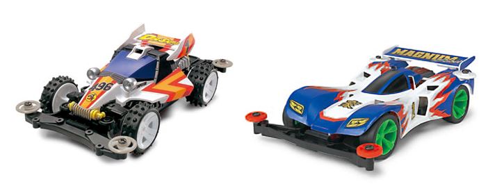 左が「ダッシュ!四駆郎」で主人公・日ノ丸四駆郎が使っていた「ダッシュ1号・皇帝(エンペラー)(MSシャーシ)」で、右が「爆走兄弟レッツ&ゴー!!」の主人公のひとり、星馬豪が使っていた「マグナムセイバー プレミアム (スーパーIIシャーシ)」。どちらもシャーシなどのパーツは発売当初から進化していて、現在でも購入できます