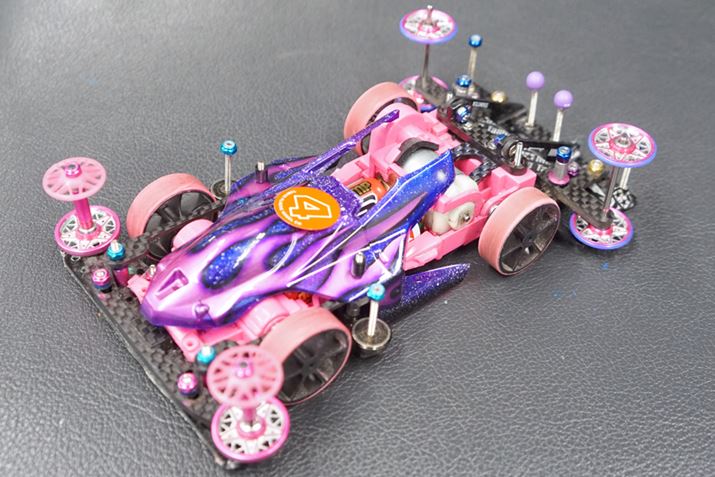 ミニ四駆のマシンをタミヤ公認レースに出場させる場合、レギュレーションの範疇でタミヤ製品を使って作りさえすれば、マシンの改造やデザインは自由。ここでは改造についての詳細は省略しますが、記者発表会「ミニ四駆メディアミーティング & レース2017」でマスコミの人たちが作ってきたマシンを以下で紹介します。2012年当時から、筆者は毎年行われるこの記者発表会に参加していますが、年々、参加者たちの改造レベルも上がっていることを実感させられます。