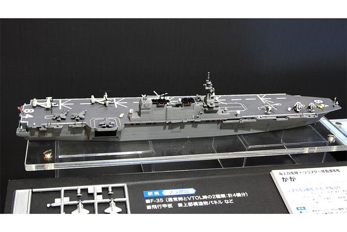 「海上自衛隊 ヘリコプター登載護衛艦 かが」1/700スケールモデル(ハセガワ)。最新鋭戦闘機「F-35」(通常時とVTOL時の2種類)のほか、艦載用「MCH-101」「SH-60K」などが付属する。6月2日頃発売予定。価格は4,000円(税別)