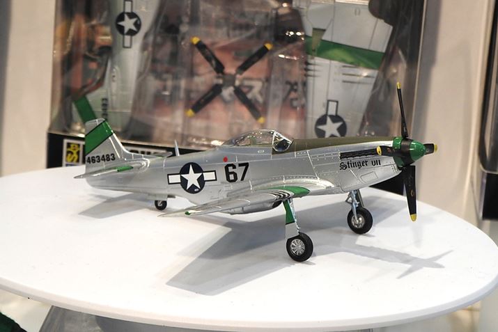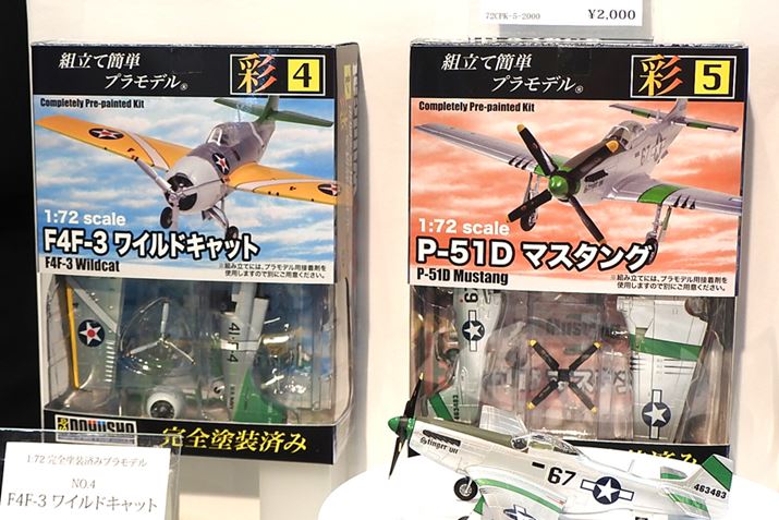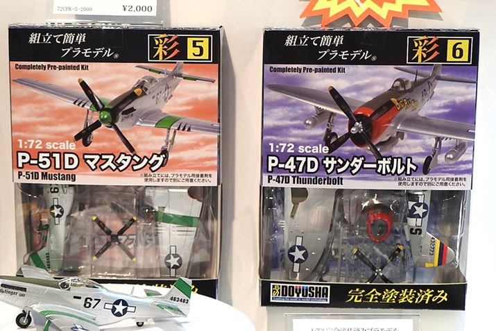 ちらは、童友社ブースで見つけた、組み立てるだけで完成する完全塗装済みプラモシリーズ。第二次世界大戦時のアメリカ軍のレシプロ戦闘機「P-51D マスタング」など全6種(童友社)。プラモデル入門にうってつけですね。「P-51D マスタング」(左)と「P-47D サンダーボルト」(右)。価格は2,000円(税別)