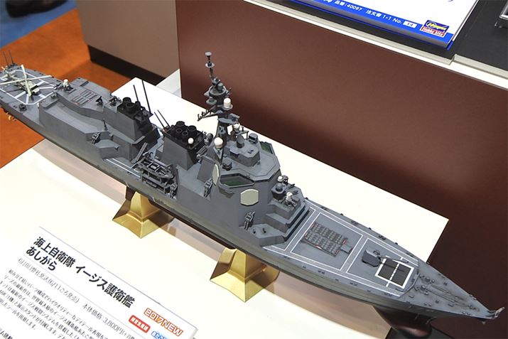 ハセガワブースでは、海上自衛隊イージス護衛艦「あしがら」1/450スケールモデルが注目を集めていました。海自の最新鋭イージス艦「あしがら」は、4月末に米軍の原子力空母「カール・ビンソン」との共同訓練に向かったことで一気に知名度があがりましたね。