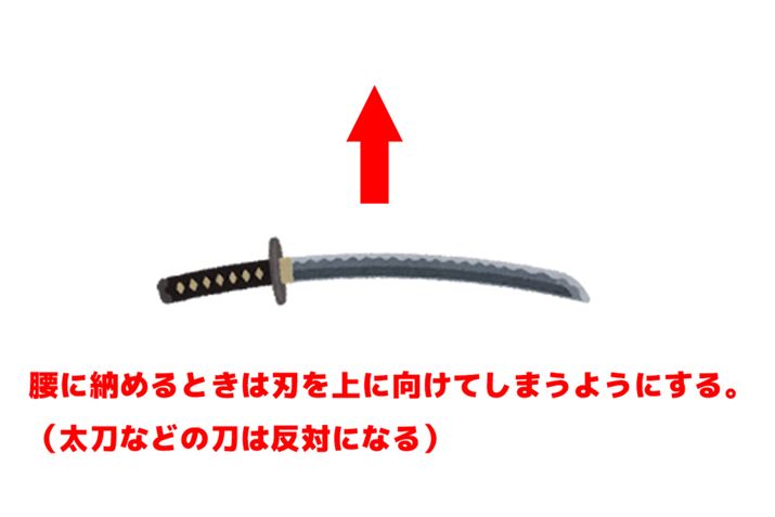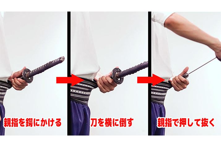 刀を抜く際は鍔(つば)に親指をかけ、刀を横に押し倒し、親指で押し出してから抜くようにする。この動作を「鯉口を切る」と呼ぶ。何かわかんないけど響きがカッコいい! 時代劇っぽい!!