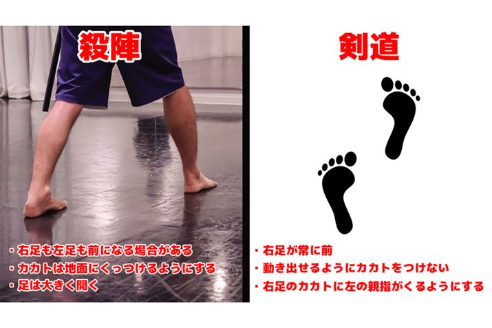 しかし殺陣は「魅せる」ために行うので、足を大きく開きカカトは地面につけるようにする。動きを大きく見せて、どっしりと構えを見せるためだ。