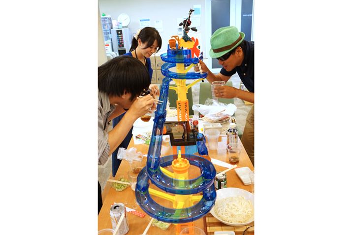 みな、真剣なまなざしで構えております。誰もが麺をすくうのに必死で思わず夢中になっていたようです。ちなみに、プレイ人数は2〜10名に設定されていますが、大人だけの場合、本体を囲むのは6〜7人が限界かも。間に子供が入るのであれば、10人でも楽しめると思います